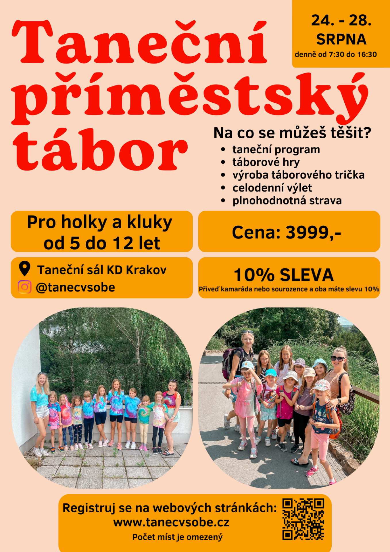 Přidej se k nám na nezapomenutelné dobrodružství na tanečním příměstském táboře TANEC V SOBĚ! Od 24. do 28. srpna 2026 čeká na děti ve věku 5-12 let týden plný tance, radosti a nových přátelství, přímo v prostorách KD Krakov. Naši zkušení vedoucí provedou děti různými tanečními styly. Dále na děti čeká spoustu her a jednodenní výlet.
